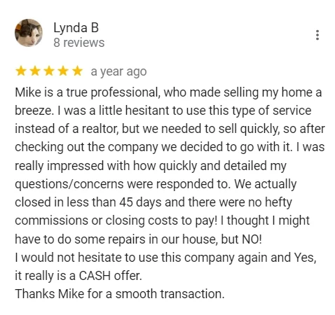 Unless you are an outstanding company, I am not one to leave a review. I must say Official Cash Offer went out of their way to make sure the sale of my house went through without a hitch. This was my first time selling a house, so I had lots of questions, and he was quick to call me back to answer. I would not hesitate to use his service again. Thanks for a smooth transaction!